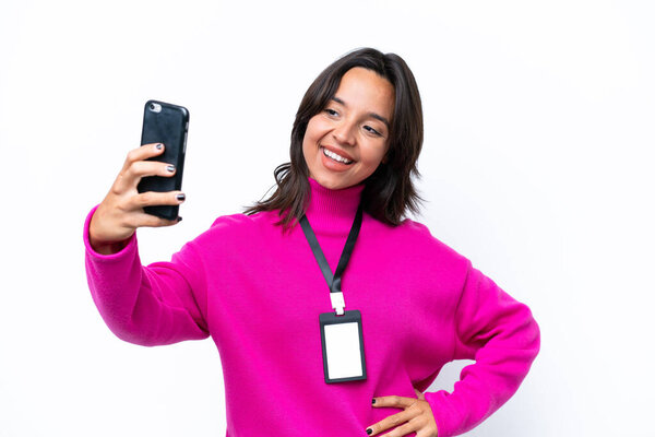732350682 Young hispanic woman with ID card isolated on white background making a selfie