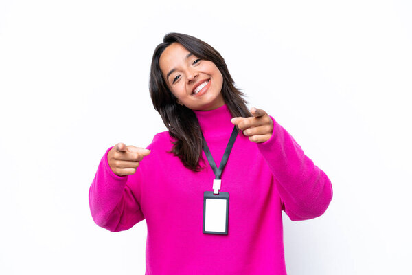 735196344 Young hispanic woman with ID card isolated on white background points finger at you while smiling
