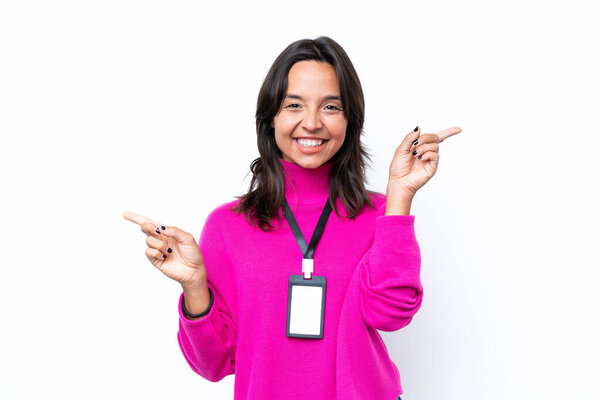 741465390 Young hispanic woman with ID card isolated on white background pointing finger to the laterals and happy