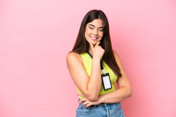 820243426 Young Brazilian woman with ID card isolated on pink background saluting with hand with happy expression