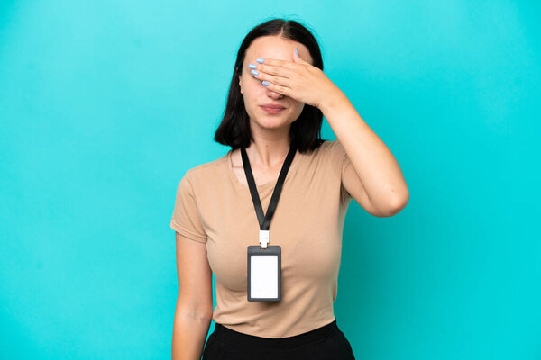 830039558 Young caucasian woman with ID card isolated on blue background covering eyes by hands. Do not want to see something