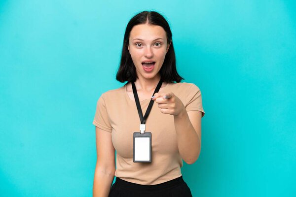 833525888 Young caucasian woman with ID card isolated on blue background surprised and pointing front