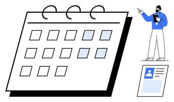 795398110 Large spiral-bound calendar highlighting dates, man in blue shirt and white pants pointing, ID card displayed. Ideal for scheduling, planning, presentation, time management, organization, teamwork