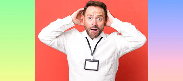 647015470 Middle age man looking desperate, frustrated and stressed. vip pass id accreditation