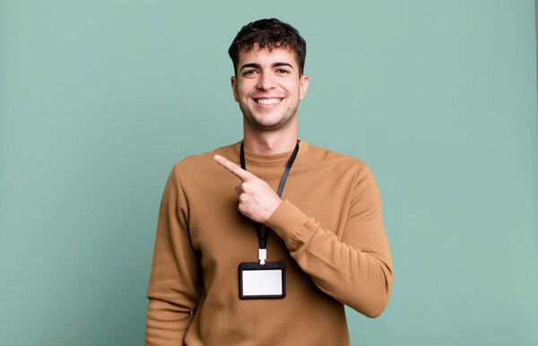 621572624 Adult man smiling cheerfully, feeling happy and pointing to the side with an acccess identity card