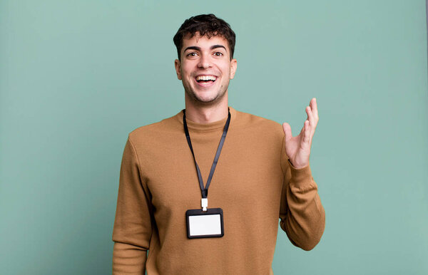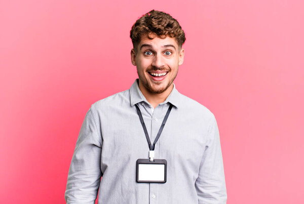 635386908 Young adult caucasian man looking happy and pleasantly surprised. blank accreditation pass card id concept