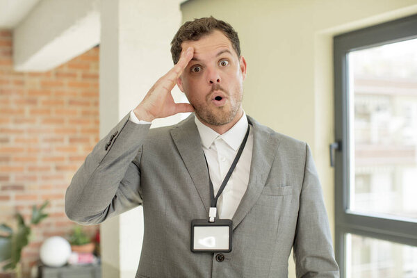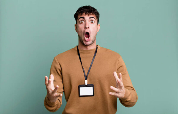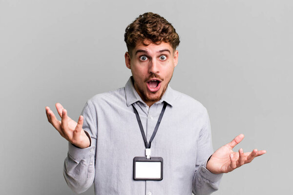 656836134 Young adult caucasian man amazed, shocked and astonished with an unbelievable surprise. blank accreditation pass card id concept