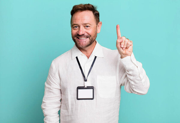 628658102 Middle age man smiling and looking friendly, showing number one. vip pass id accreditation
