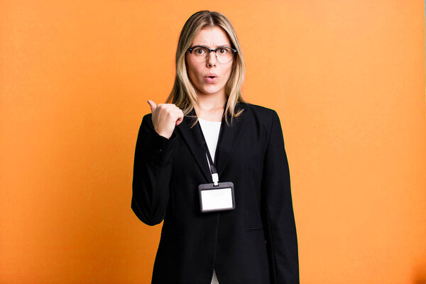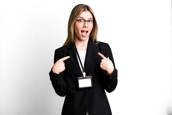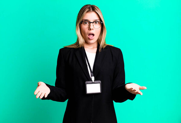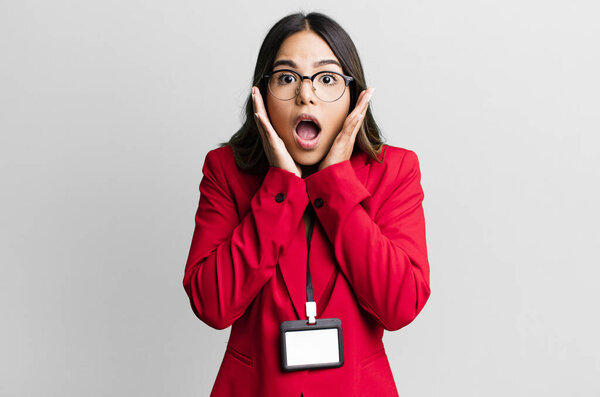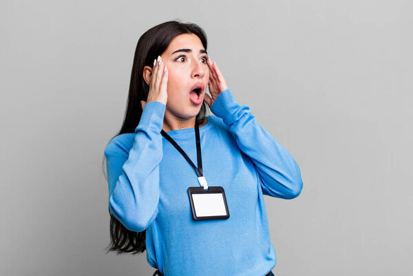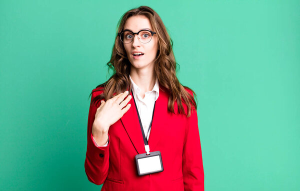 634116202 Young pretty woman looking astonished in disbelief. id card accreditation concept