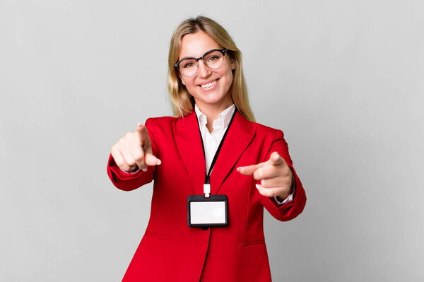 589577322 Hispanic pretty woman pointing at camera choosing you. vip pass card id