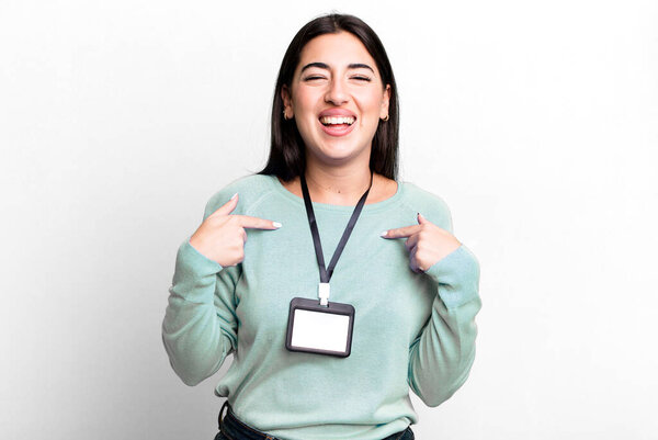 628731718 Young pretty woman feeling happy and pointing to self with an excited. id card accreditation concept