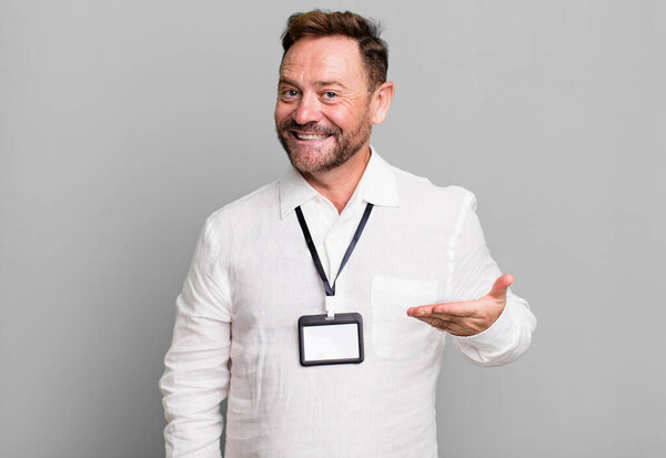 634086448 Middle age man smiling cheerfully, feeling happy and showing a concept. vip pass id accreditation
