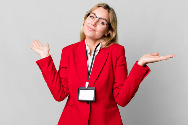635352794 Young adult pretty businesswoman and a accreditation pass card id