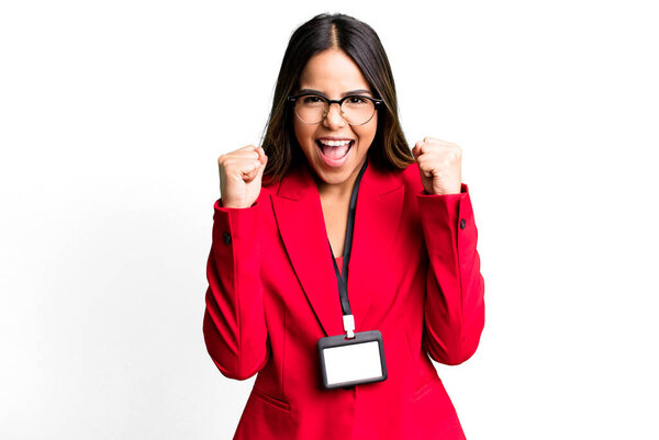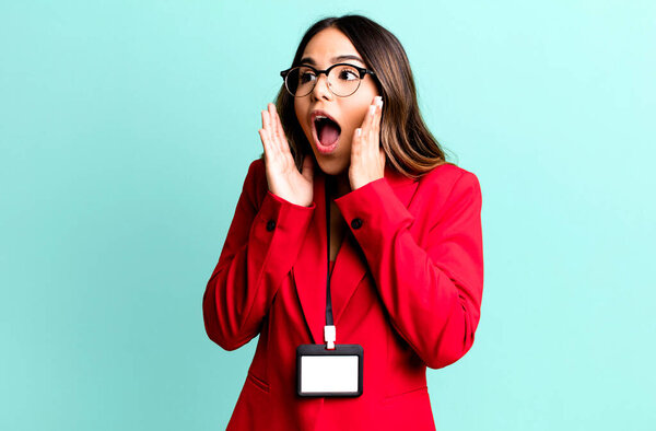 634134208 Hispanic pretty woman feeling shocked,laughing and celebrating success with an accreditation card pass