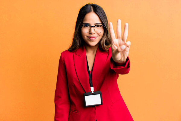 634134270 Hispanic pretty woman smiling and looking friendly, showing number three with an accreditation card pass