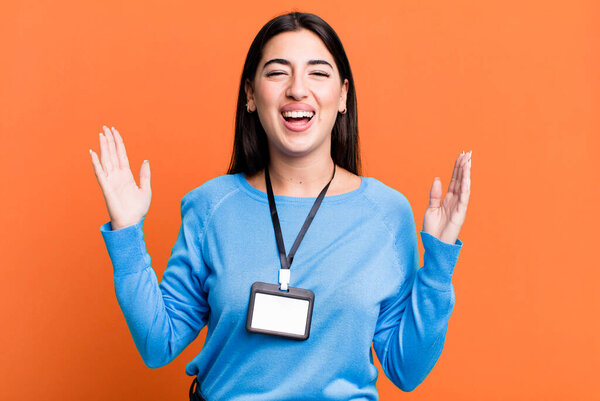 641867948 Young pretty woman laughing out loud at some hilarious joke. id card accreditation concept