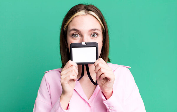 634116228 Young pretty woman looking happy and pleasantly surprised. id card accreditation concept