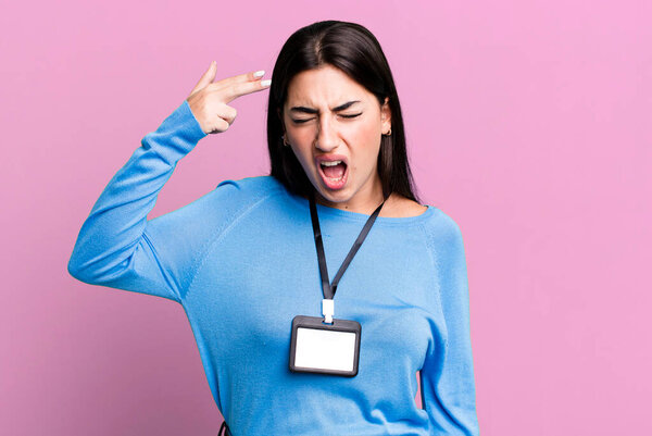 638652290 Looking unhappy and stressed, suicide gesture making gun sign. vip pass id accreditation