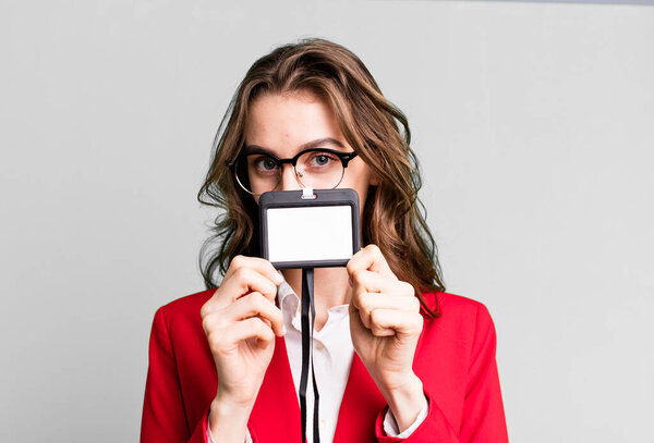 593398044 Pretty caucasian woman feeling puzzled and confused. vip pass id card concept