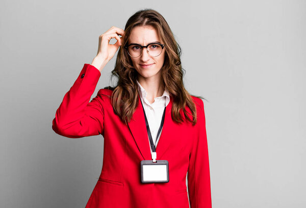 641862332 Young pretty woman feeling confused and puzzled, showing you are insane. vip pass accreditation concept