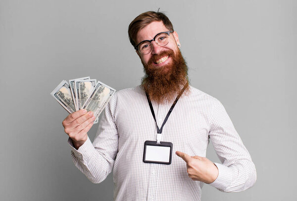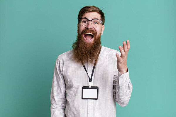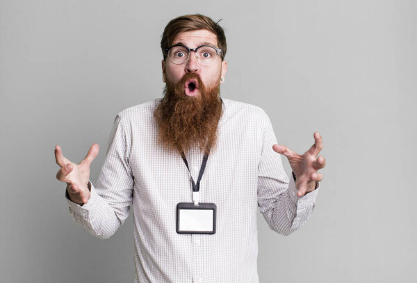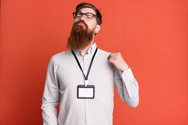 641864598 Young adult red hair bearded cool man with a vip pass accreditation card