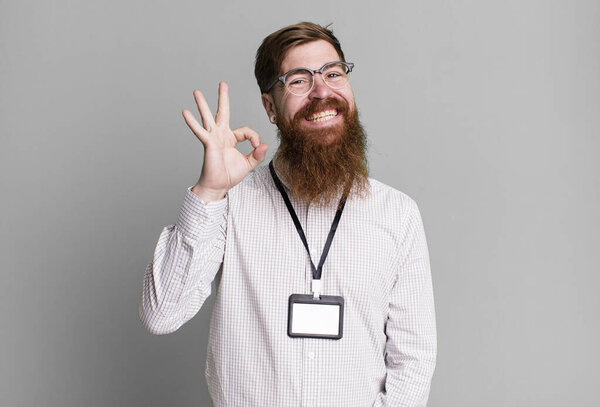 641867142 Long beard man feeling happy, showing approval with okay gesture. vip badge accreditation concept