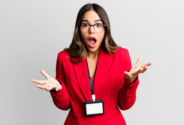 647058436 Hispanic pretty woman looking happy, astonished and surprised with an accreditation card pass