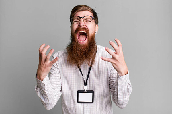 647049756 Long beard man looking desperate, frustrated and stressed. vip badge accreditation concept