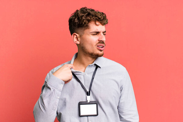 647054664 Young adult caucasian man feeling stressed, anxious, tired and frustrated. blank accreditation pass card id concept