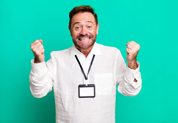 649940510 Middle age man feeling shocked,laughing and celebrating success. vip pass id accreditation