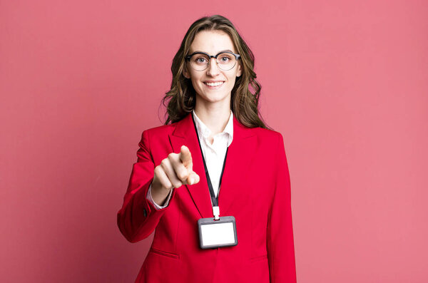 652938248 Young pretty woman pointing at camera choosing you. vip pass accreditation concept