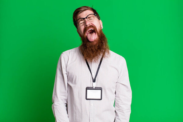 656830182 Long beard man with cheerful and rebellious attitude, joking and sticking tongue out. vip badge accreditation concept
