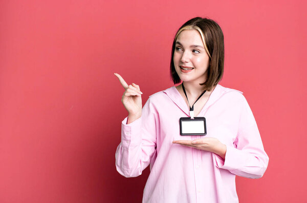 593397946 Pretty caucasian woman looking excited and surprised pointing to the side. vip pass id card concept