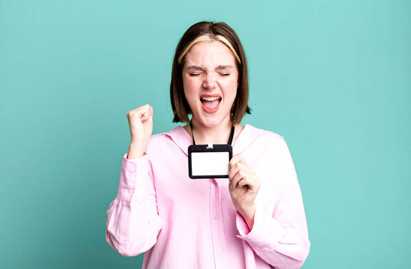 593398062 Pretty caucasian woman screaming with hands up in the air. vip pass id card concept