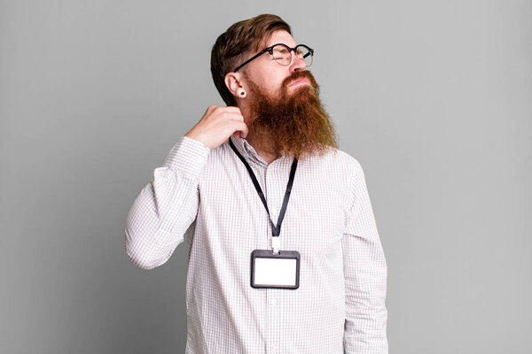 660795954 Long beard man feeling stressed, anxious, tired and frustrated. vip badge accreditation concept