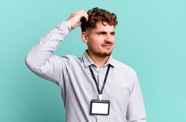 660798194 Young adult caucasian man feeling puzzled and confused, scratching head. blank accreditation pass card id concept