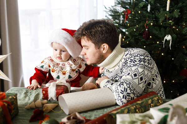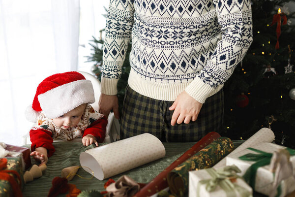 834638158 Merry Christmas! Happy father and baby son in santa hat and stylish festive sweaters wrapping together christmas presents on background of modern decorated tree. Joyful family time