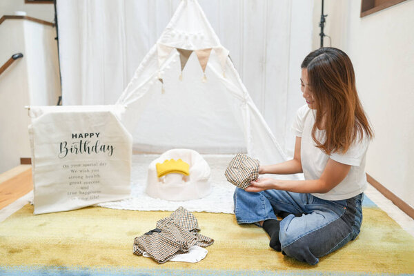 846767408 A woman sits on a rug with a white tent and a bag that says Happy Birthday. She is holding a bag and she is organizing or packing something