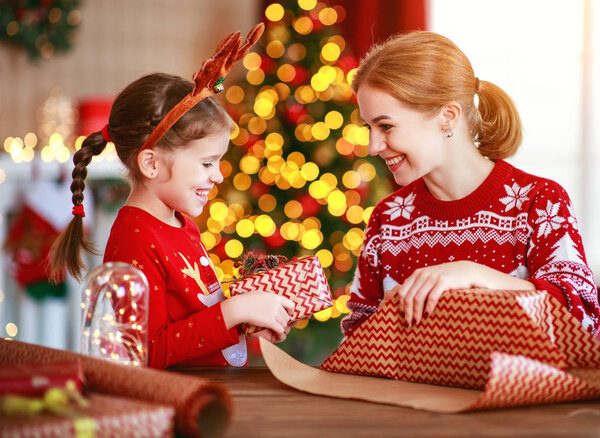 318509790 A happy family mother and child pack Christmas gifts at home near the Christmas tre
