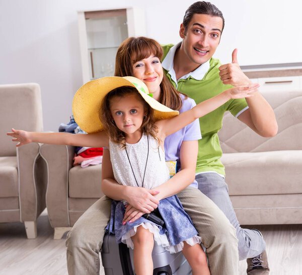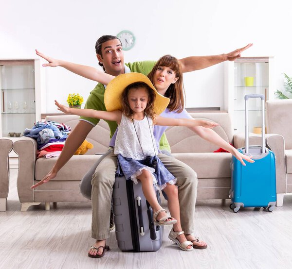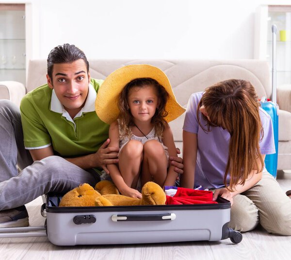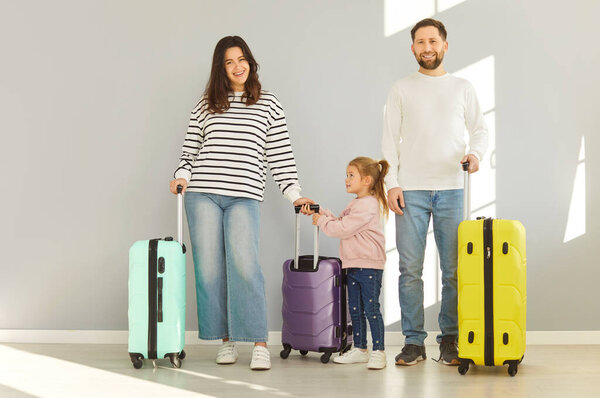 798991290 Family traveller tourist, parents, daughter child standing near wheel bright suitcases, ready for summer trip holiday, luggage bag vacation travel, clothes into suitcase journey, planning relocation