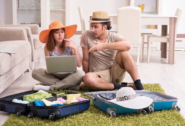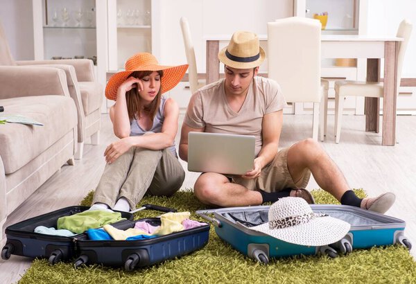 799637132 Young loving tourist couple at home, happy planning bright summer trip holiday, beach, packed luggage bag for vacation travel, things into big suitcases, family dreaming of travelling, honeymoon