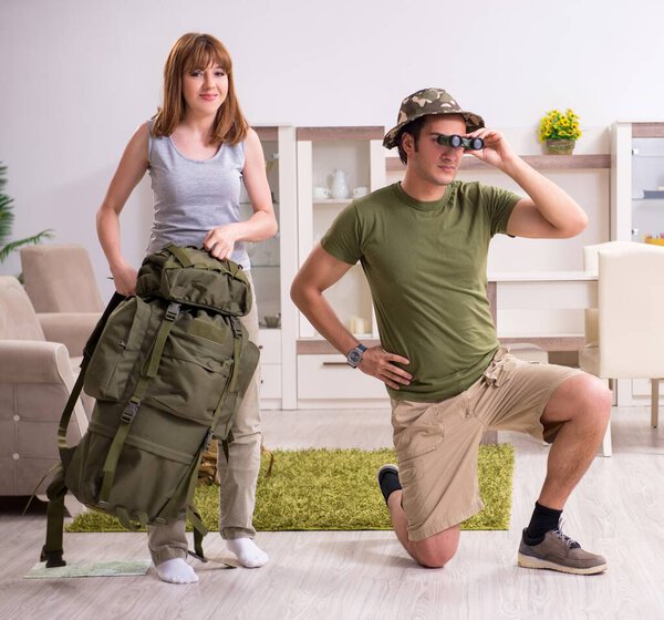 784724934 Married couple preparing together at home for summer vacation, organizing travel essentials and looking forward to a fun trip. Teamwork and excitement make for a joyous start to adventure or tourism.