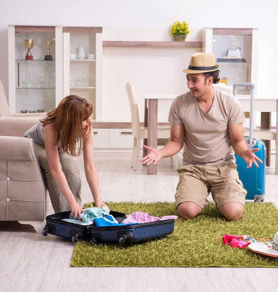782630720 Young positive couple is packing a suitcase at home, preparing for a summer vacation or travel. The family is getting ready for trip, emphasizing preparation and holiday excitement.