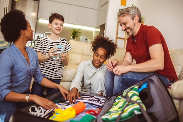 819914788 Preparing for vacation. Cheerful family of four is packing suitcase for summer vacation at home in living room. Parents and kids with smiles collect everything they need to relax on beach or by pool.
