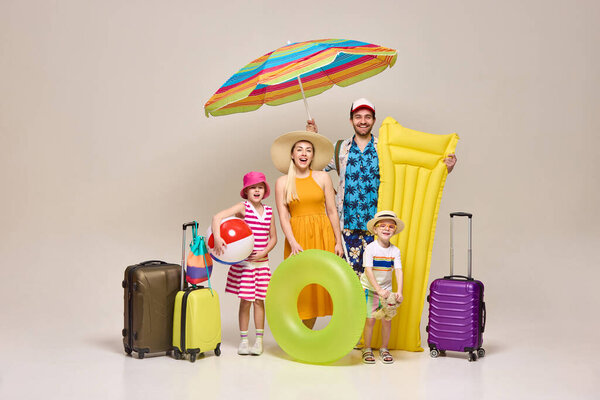 791630936 Family smiling with inflatable rings, beach ball, colorful umbrella, preparing for seaside vacation, standing with luggage, travel essentials. Excited mood. Concept of summer trip, adventure, fun.