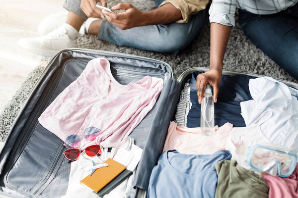 779873408 Safe Vacation During Covid-19 Pandemic. Unrecognizable Black Family Couple Putting Sanitizer Packing Suitcase Preparing For Trip At Home. Modern Tourism And Travel. Cropped, High Angle Shot