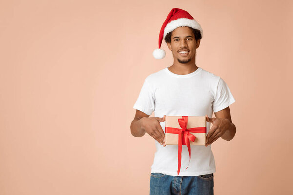 811059824 Husband Santa Claus holds box in holiday packing with ribbon to surprise for wife at New Year or Christmas. Cheerful man in hat holds box and looks at camera, isolated on light background, studio shot