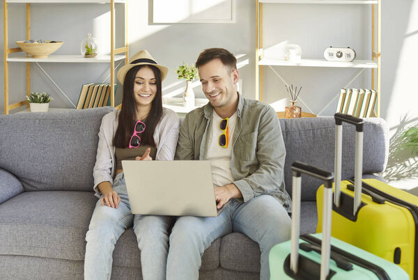 828079090 Happy loving couple planning trip after quarantine, buying low price tickets and booking hotel online, using laptop while sitting in living room with packed suitcases nearby