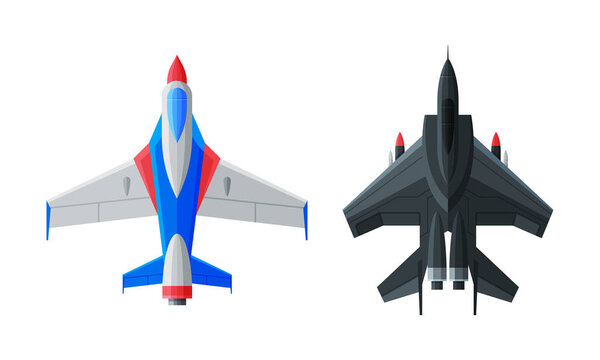530387050 Flying Aircraft with Jet Engine View from Above Vector Set. Airplanes as Air Transport and Aviation Concept