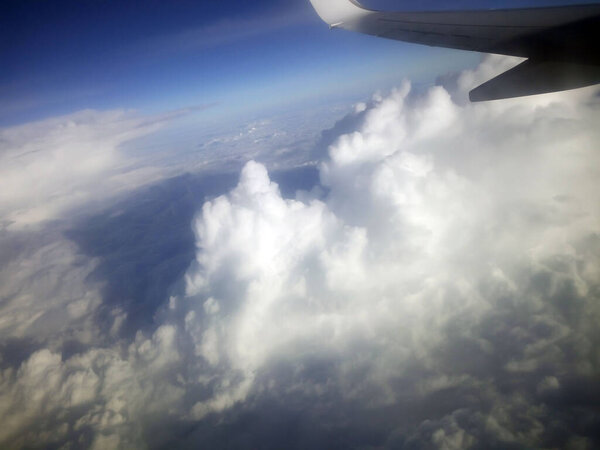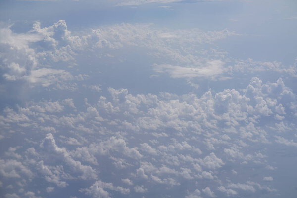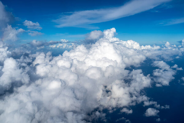 798395786 Majestic white clouds float above the deep blue Pacific Ocean, captured from an airplane flying over French Polynesia. A breathtaking high-altitude perspective